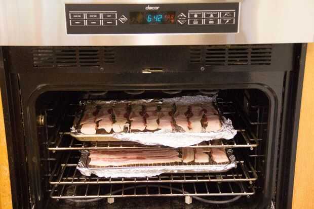 Poner el tocino en el horno con dos parrillas mediados por unos 15-20 minutos Verifique en él a medio camino a través de y asegúrese de que todas las tiras se cocinan uniformemente. Tuve que cambiar las hojas para hornear a la mitad para que el tocino cocido uniformemente en ambas hojas.