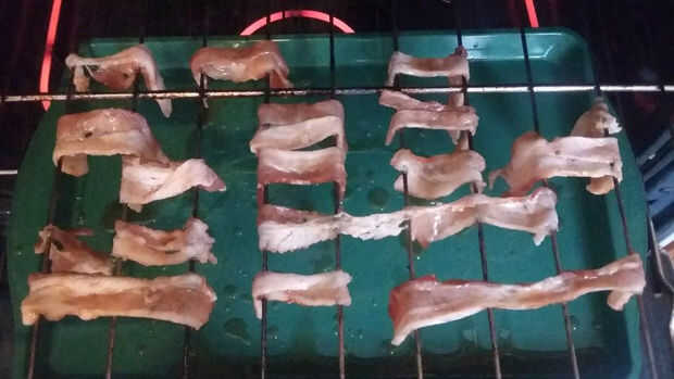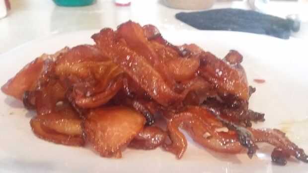 Precalentar el horno a 375 grados F. Tomar tocino y poner en una bolsa Zip-Lock con 1/4 taza de azúcar moreno ligero. Agite hasta que el tocino está cubierto. Coloque el tocino sobre una rejilla en el horno (Asegúrese de colocar una placa para horno bajo para coger líquidos que caen) y hornear durante unos 15 minutos o hasta que el tocino esté crujiente. Retire del horno deje enfriar y cortar en trozos grandes.