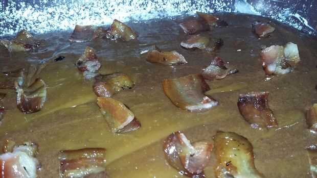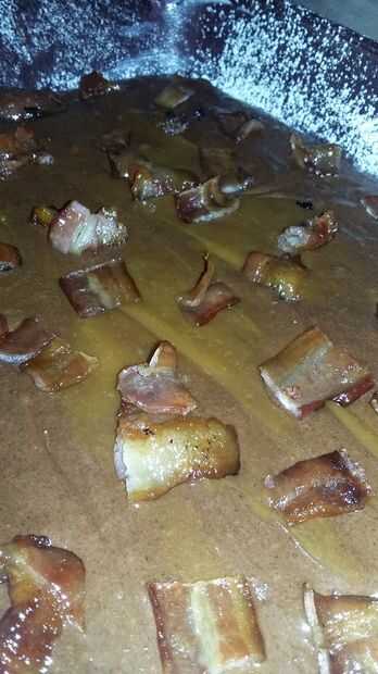 Coloque la mitad de la masa en su engrasado y rocía la mitad de la salsa de caramelo o dulce de leche, en la masa, agregar la mitad de la panceta a la parte superior del caramelo. Repita con la masa restante, salsa de caramelo y tocino.