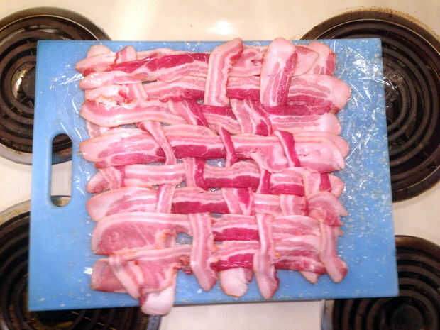 Tomar el tocino y un bacon cuadrado base de la armadura. Intenta hacer el tejido tan apretado como sea posible.