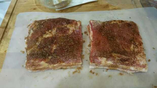 Vamos a empezar. Hacer su propio tocino casero no es difícil pero toma tiempo. Comencé por ir a mi tienda local y pedir al carnicero un par de losas de panceta de cerdo. Cuando llegué a casa cortado el vientre para que fueran cuadrados (para que cuando usted corte tienes rebanadas de tamaño igual). Mayoría de las veces, el trozo de panceta de cerdo que tienes en la tienda tiene en la piel. Puede tratar de cortarlo antes de aplicar la cura, pero por experiencia, te diré más fácil cortar una vez completado el proceso de fumar. A continuación hice la cura. Usar azúcar morena, sal y jarabe de arce Real en la mayoría de mis lotes. He utilizado fricciones con barbacoa y cura de pastrami. Salieron bastante bien también. Supongamos que tenemos una losa de panceta de cerdo que es aproximadamente 2 libras. Usé 1/4 de taza de sal gorda, 1/4 taza de azúcar morena y 1/4 de taza de jarabe de arce para mi curación. Mezclar en una pasta y aplicar curación por todo el vientre del cerdo. Después la panceta está cubierto con la curación lo coloque en una bolsa de ziplock conseguir tanto el aire como sea posible. Poner en la nevera y dale la vuelta cada día durante 7-10 días. Bancos asegurar una curación incluso en toda la carne.