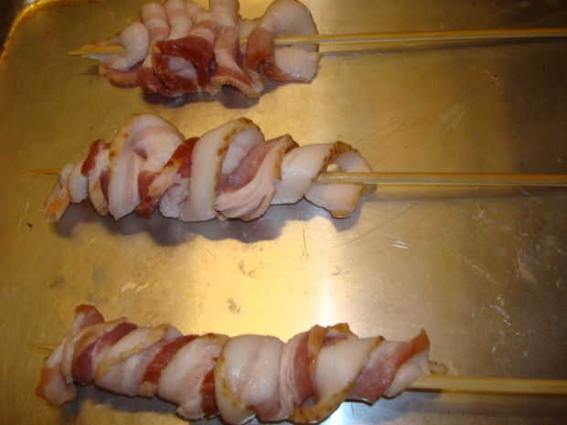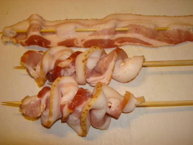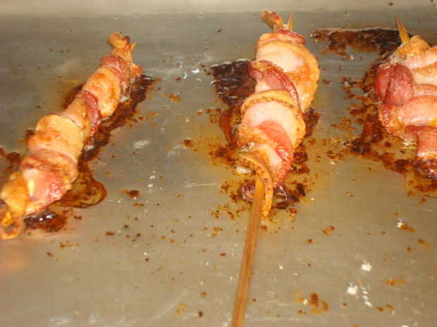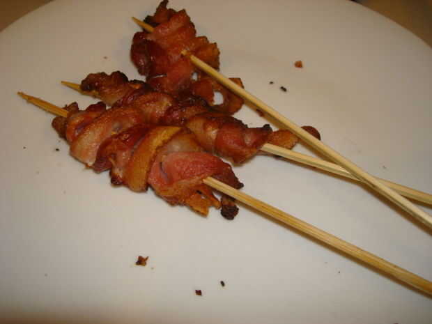 Coloque los pinchos en las galletas de tal manera que los extremos no se empapa con grasa de tocino.