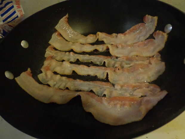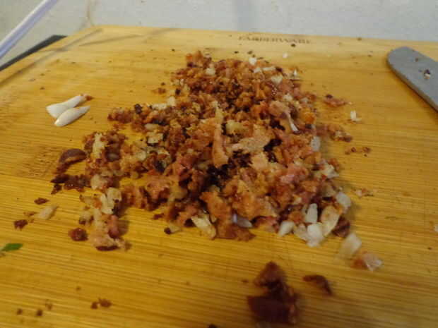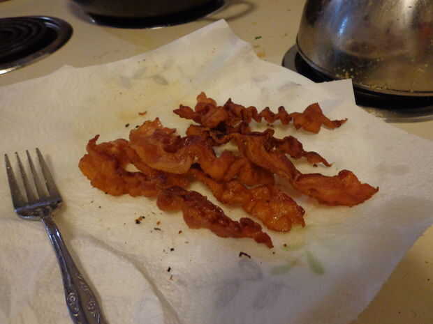 Luego picar para arriba en los bits más pequeños que se puede.  Mmmm.  Trozos de tocino.