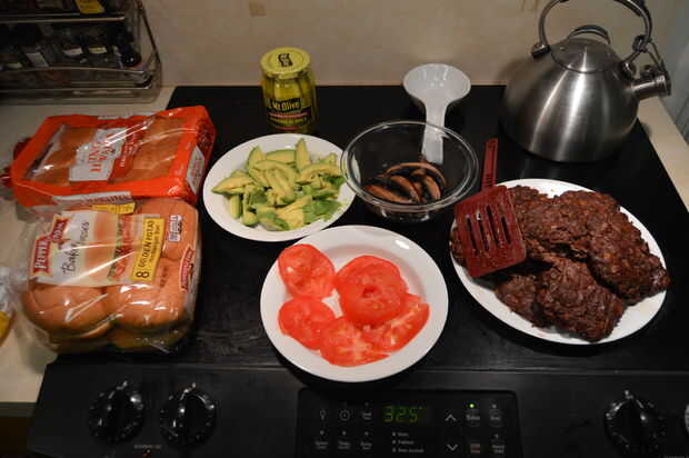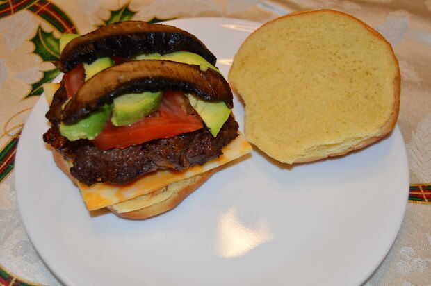 Para la construcción empezó con un bollo de hamburguesa de patata pan con una rebanada de Colby Monterrey queso sobre el pan inferior entonces agregó la hamburguesa encima. Siguiente una gran rebanada de tomate entonces tres piezas cortadas de un aguacate tiene dos rebanadas de champiñones portabella y remata con el pan. Este tocino infundido hamburguesa de carne de venado es tan bueno, que no añado ningún condimentos.