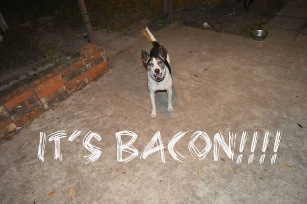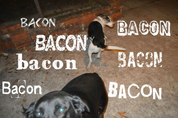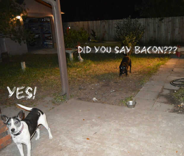 Para que mis perros aman cuando cocino hasta tocino! Para que nada va a perder junté un convite para los mismos. La grasa de tocino dos claras de huevo y algún venado superior a su comida de esta noche! Volvió locos para él.