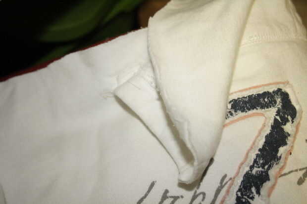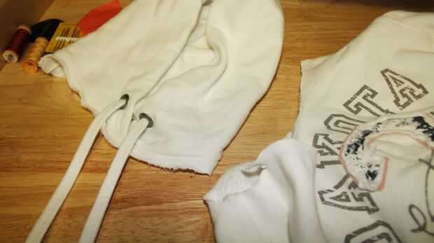 1) cortar la capucha de la sudadera, dejando aproximadamente una pulgada de la tela alrededor de los bordes