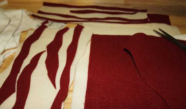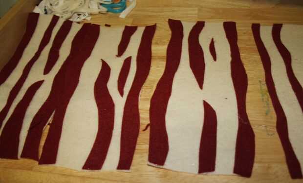 11) usando el ancho de la bufanda para aproximar, tomar la crema coloreada fieltro y crear 6 rectángulos ondulados que son del mismo grosor que la guarnición y 12 "de largo