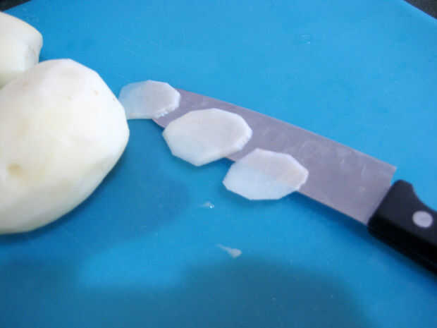 Busca un sector que es un poco más grueso que una hoja de papel.  No la rebanada más delgada puede hacer, pero cerca de él.  Pelarlas primero si es su preferencia y por todos los medios utilizar su máquina de cortar de mandoline si tienes uno.  Una libra de tocino hizo más que suficiente grasa para freír 3 papas.
