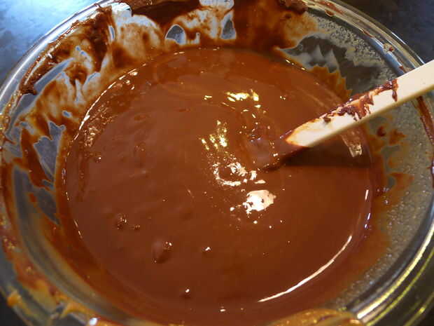 Mientras que el tocino es de enfriamiento, puede empezar a hacer la capa interna de chocolate para el chow cachorro. En el tazón pequeño microondas, añadir 12 onzas de chocolate semiamargo, 1/2 taza (1 barra) de mantequilla y 1 taza de mantequilla de maní. Colocar todo esto en el microondas durante 2-3 minutos, revolviendo cada 45 segundos aproximadamente. Asegúrese que todo esté homogéneo.