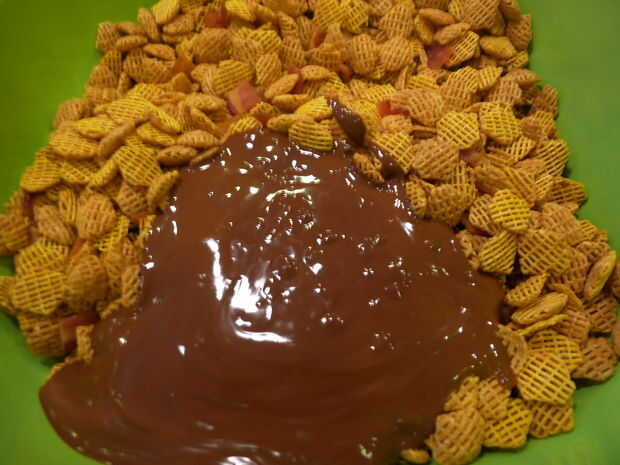 Pour la caja entera de cereal en un tazón enorme. Sea el recipiente más grande que se puede encontrar. Ayuda a tener un montón de espacio para la mezcla para que no lleves mucho el cereal. Añadir el bacon en el vaso y mezcle todo suavemente pulg utilice su espátula para sacar toda la mezcla de chocolate sobre el cereal. Al principio puede no parecer como él, pero allí será suficiente. Mezcle lentamente y suavemente con una cuchara grande hasta que todos los ingredientes son uniformemente cubiertos con chocolate.