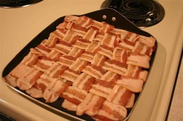 Primero necesitamos algunos gruesa buen tocino. Alrededor de 14 piezas. Tejen el tocino como se muestra en el cuadro, abajo. Puede hacerlo en su sartén de freír.
