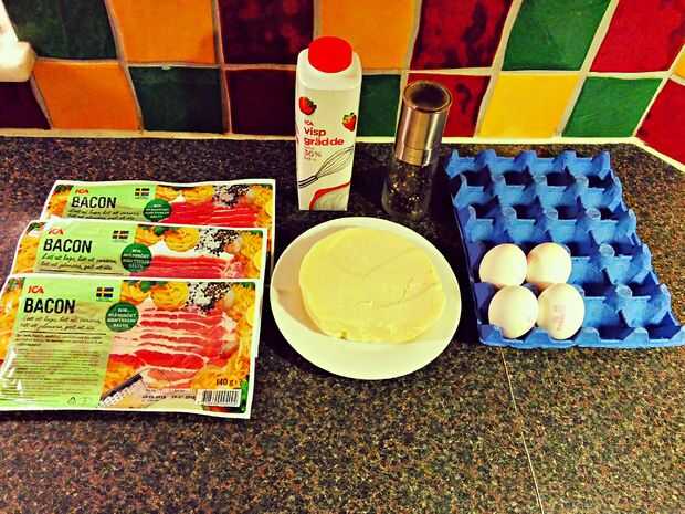 × 3 paquetes de tiras de tocino, 5-7 en cada paquete. × Un todo o la mitad de queso, debe ser rallado en un plato completo. × 5 dl (2,1 tazas) de crema. × 4 huevos × Pimienta