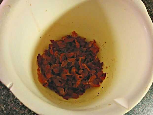 Freír el bacon durante 10 minutos o más hasta llegar crujientes. No se necesita mantequilla para la bandeja. El tocino es tan graso de todos modos. Después de que han conseguido crujientes ponerlas en un bol. Asegúrese de que obtener toda la grasa allí también. Esto le dará más sabor.
