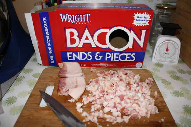 Por otra parte, cortar las rebanadas de tocino en cuadrados o astillas para ser utilizado como la capa final.