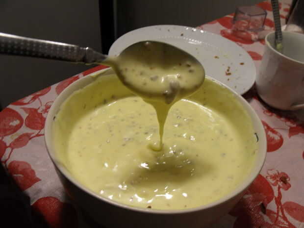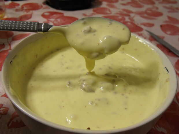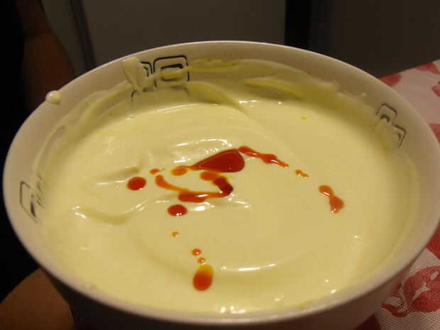 Puede salir un poco de colorante de alimentos en la Baconnaise y mezcla.