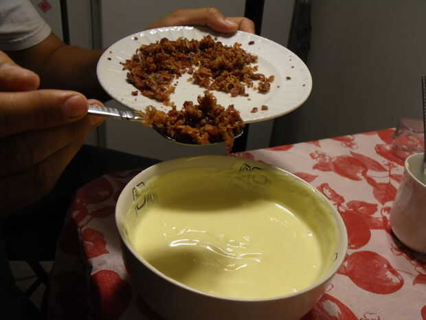 Si quieres que crujiente Baconnaise corta el tocino frito en trocitos pequeños y añadir a él si no sólo dejarlo como eso y tienes crema Baconnaise.