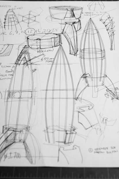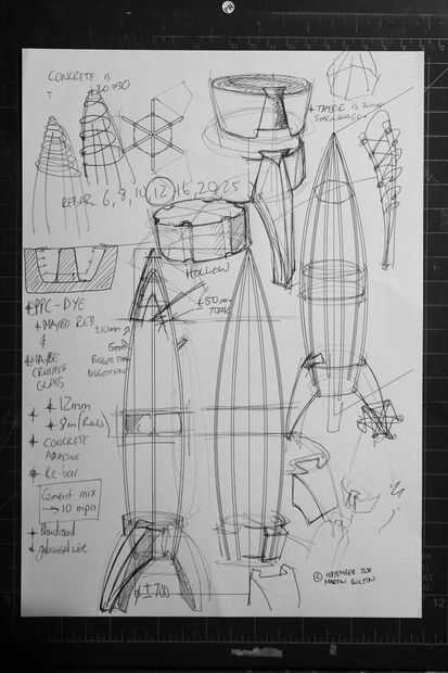 Al principio el diseño fue planeado con dibujo en papel. Estos eran bocetos para intentar comprender la realización de la forma. Quería utilizar materiales de construcción estándar, así como incorporar material de desecho en la construcción. La forma era que las secciones de barras de refuerzo estándar que se utilizan en la industria de la construcción. Al interactuar con los materiales, observé que la varilla de metal flex en una forma conveniente para el cuerpo del cohete. Esto sólo es posible si se extiende alrededor de una central 'bloque separador'. Moldes para los diferentes componentes, que he creado nuestro de residuos 2mm ABS recortes de plástico que obtuve de una compañía de señalización.