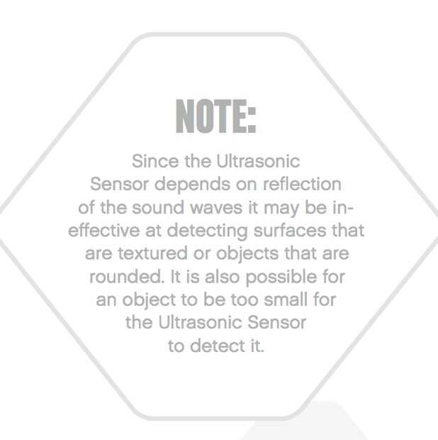 Distancia a un objeto puede medirse en pulgadas o centímetros. Esto le permite programar su robot para detener a cierta distancia de una pared. Centímetros, la distancia detectable es entre 3 y 250 centímetros (con una precisión de +/-1 cm). Si se utilizan unidades de pulgadas, la distancia mensurable es entre 1 y 99 pulgadas (con una precisión de +/-0,394 pulgadas). Un valor de 255 centímetros o pulgadas 100 significa que el sensor no es capaz de detectar cualquier objeto delante de él. Una luz constante alrededor de los ojos del sensor indica que el sensor está en el modo de medición. Una luz parpadeante indica que es en el modo de presencia. En el modo de presencia, este sensor puede detectar otro Sensor ultrasónico funcionamiento cerca. Cuando se escucha para la presencia, el sensor detecta sonido señales pero no enviarlos.