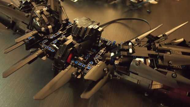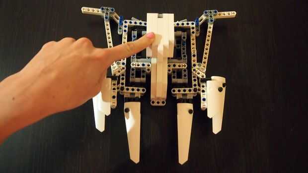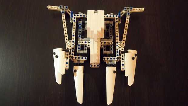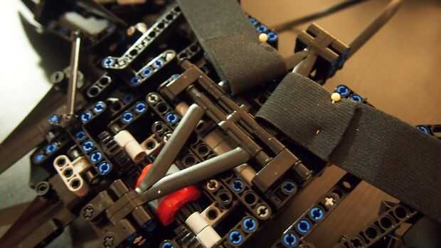 Cuando las obras de mecanismos (probar empujando hacia adentro y hacia fuera y ver si todo está estable y el motor o mecanismo no está bloqueado) cubren el motor con rayos de Lego [ver foto] y crean soporte de cinturón en la parte posterior para que usted pueda montar elástico + clips para sujetar las alas en la espalda, mochila estilo. Para rematar.