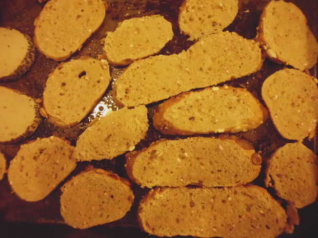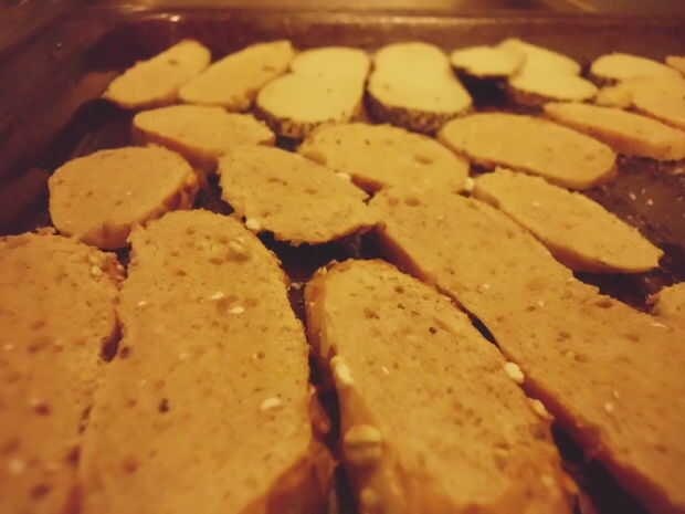 Pulverizar las galletas con aerosol de cocina antiadherente para que los chips no se pegan a la sartén. Arregle las rebanadas de bagel en una bandeja para que no se toquen. Nota: esto es especialmente importante si el bagel tiene una capa pegajosa, azucarada o caseosa en el exterior.
