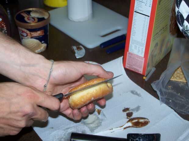 Separar las dos mitades y empezar a presionar y pellizcar abajo tripas de Donut para que se forme un estante. Esta plataforma se utilizará para el helado de la casa.