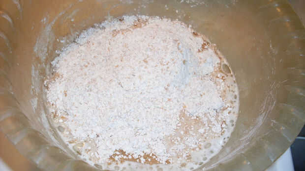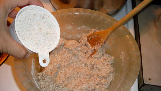 Mezcle 1 1/2 c de harina, revolver con cuchara de madera y agréguelas en el resto de la harina, amasar