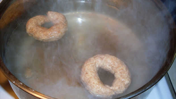 Caída de un bagel en una (o dos), durante unos minutos, o dos, la vuelta a bagel y hervir durante un minuto o dos