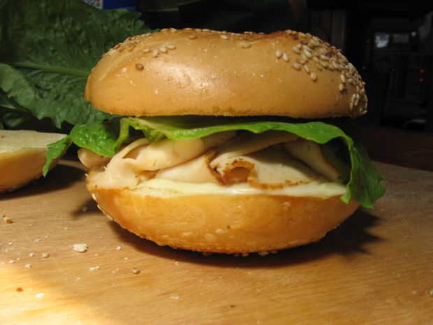 bagel. Es un alimento maravilloso. Se puede comer a cualquier hora del día. Hacer un bagel tostado con mantequilla para el desayuno. Hacer este sándwich para el almuerzo y hacer bagels mini pizza para la cena. Usted puede incluso hacer bagel chips para comer como bocadillos. Esto es un gran almuerzo que no toma mucho tiempo hacer, y es muy gratificante al final.