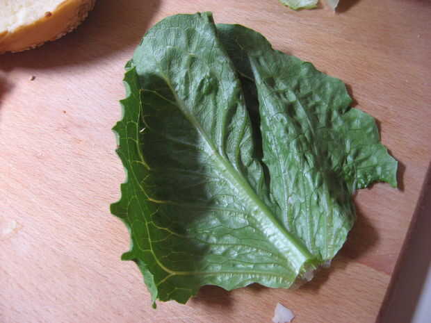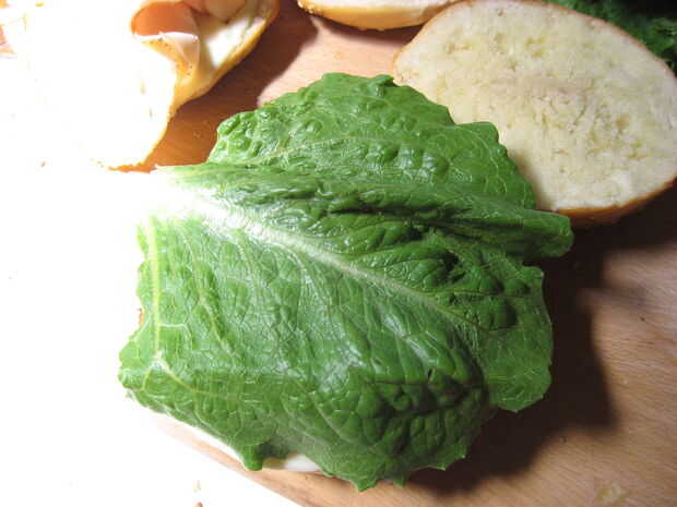 Rasgar un pedazo de lechuga de la parte superior o media de tu corazón de lechuga romana. Que no desea utilizar la parte inferior, ya que es tipo de amargo. Que sea apenas más grande que su sándwich y colóquelo en la parte superior. Poner la mitad superior del bagel en y disfruta! Trate de ajustar el sándwich! Poner tomate en así, o intentarlo con tofu! Me encantaria ver y escuchar lo que haces en los comentarios!