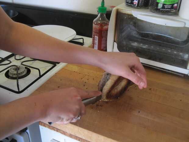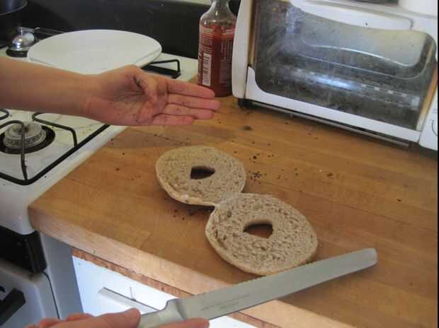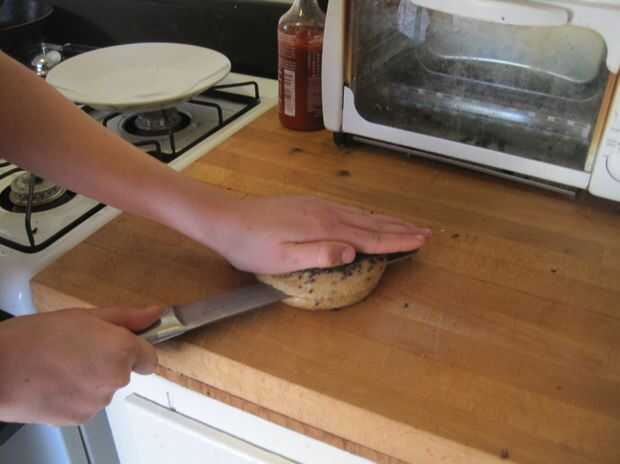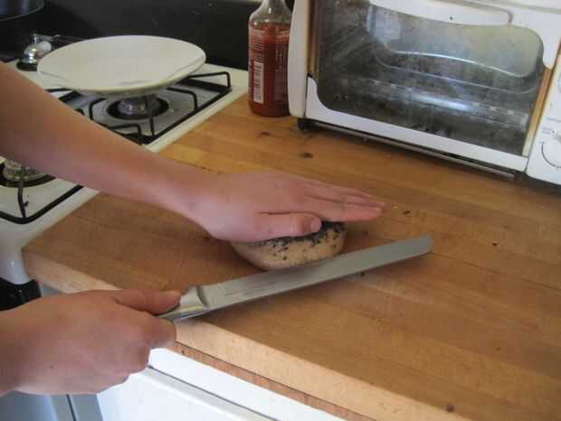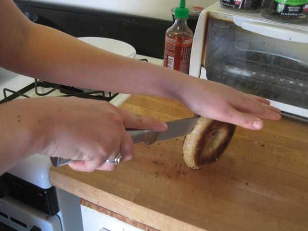 Coloque su mano sobre el bagel. Tomar un cuchillo de sierra en la otra mano, colocar en el lado de bagel y arrastre lentamente el cuchillo hacia y hacia delante hasta llegar a medio camino a través de. Una vez que usted está a medio camino a través de bagel, levante el bagel en su borde y cabo de la parte superior. Continuar corte hacia el contador hasta que estés a través de.