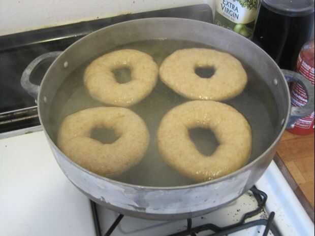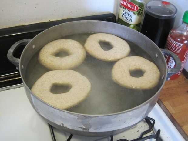 Ebullición: una vez que esté la mezcla hirvienda y lo simmering es el momento de cocer las rosquillas! Coloque tantos bollos como puede caber cómodamente dentro de la olla. Los bagels deben flotar después de unos segundos si no lo hacen inmediatamente. Deje que los bagels hervir a un lado durante un minuto, luego volteen a hervir por otro minuto. Espátula ranurada Retire los bagels de agua y coloque nuevamente en el papel para hornear ligeramente engrasada. Si utilizas toppings inmediatamente decorarles. Que mina había adornada con semillas de amapola, sal, semillas de sésamo, o los dejó llano.