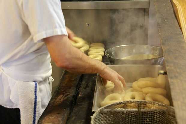 Blake elimina las tablas de madera con un trapo húmedo antes de colocar los bagels llano sobre ella para evitar que se pegue. Arreglar los bollos para que estén cerca, pero no tocar.