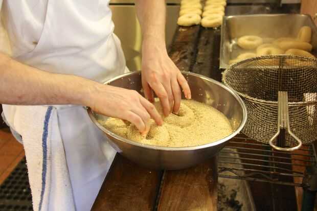 Llene un tazón grande con semillas de sésamo y dragar los bagels recién hervidas en las semillas de sésamo.