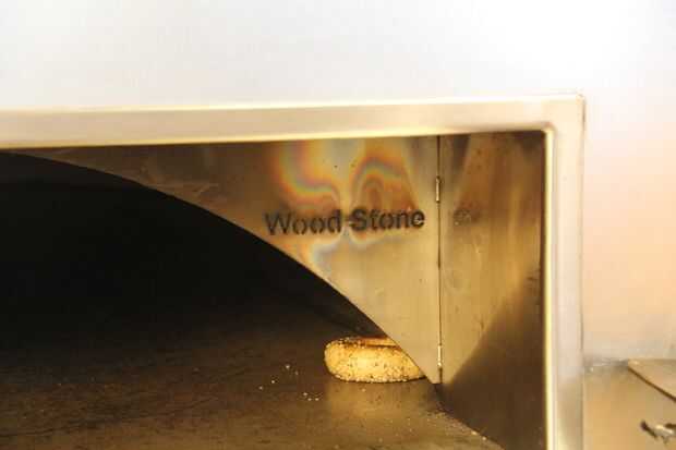 Bagels pueden por supuesto ser cocido al horno en un horno ardiente de madera no, pero la madera añade una calidad crujiente muy agradable para el bagel. Panaderos caseros simplemente pueden hornear los panecillos sobre una piedra para pizza (mejor) o galletas (aceptable) y no necesitan tender los bagels absolutamente tanto como vamos a ver a Blake en el horno comercial.