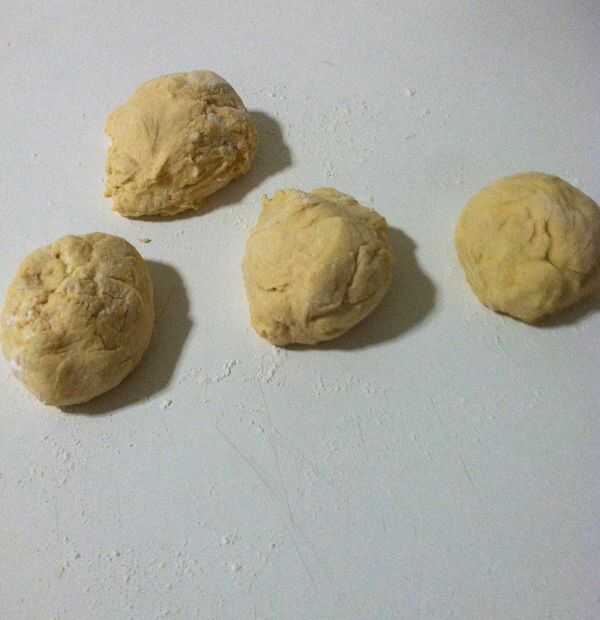 dividir la masa en cuatro. rodillo la masa entre las palmas y coaxial en forma. Presione su dedo pulgar a través del centro de cada uno. que la subida de bagels 10min como se prepara el almíbar hirviendo.
