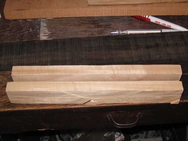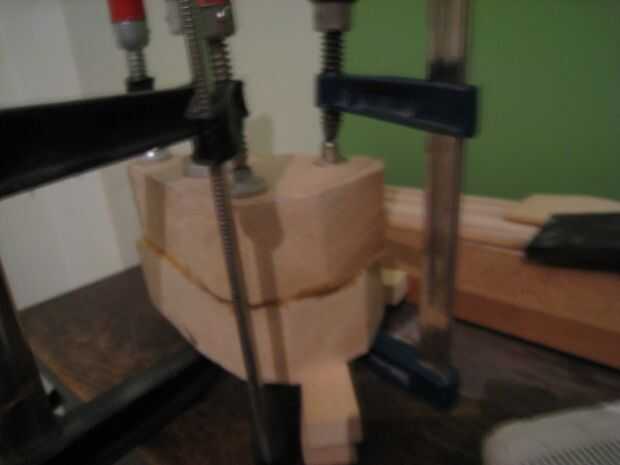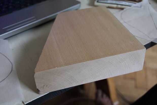 empecé con dos piezas de linden sólo 5cm de grasa. Pegado juntos para conseguir suficiente masa para modelar el cuerpo. Primero dibujé la fachada y el perfil del cuerpo en los lados de la pieza de madera ya cortadas las piezas no es necesario.