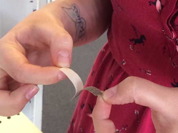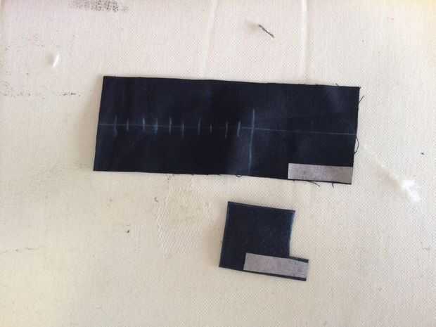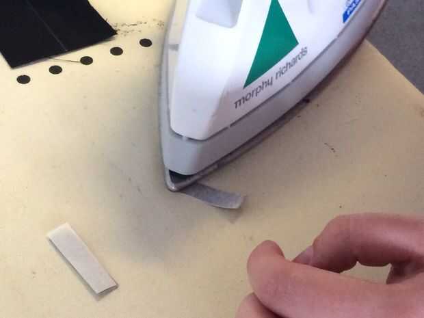 En la posición más alta con sin vapor, plancha el lado de papel bondaweb hasta el tejido conductivo. Retire el papel y luego una pieza de tela delgada y la otra al bolsillo batería de hierro