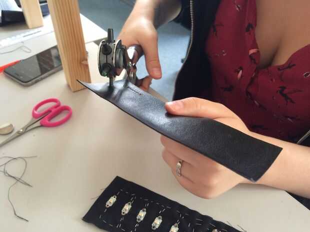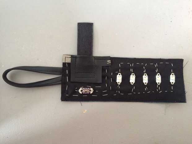 Marcar donde irá en la pieza frontal y perforar agujeros a través de los agujeros de LEDs. Utilice cualquier cosa que con seguridad puede hacer un agujero a través de su tela, hemos utilizado una perforadora de cuero.