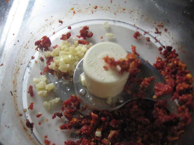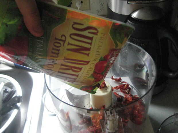 Agregar el ajo y tomates secos de sol en procesador de alimentos. Picar los tomates hasta que queden en trozos pequeños.
