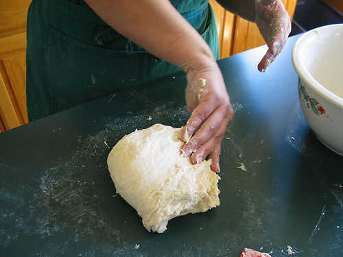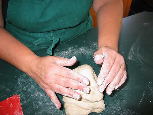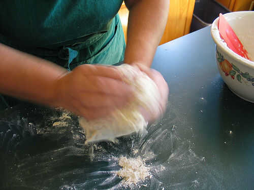 Inicialmente intente incorporar harina que quedaba en la taza. Luego empujar y de tirar la masa, empezar a doblar sobre sí mismo, cambiar direcciones y doblar otra vez. Seguir haciendo esto. Se agrega aire a la mezcla y se activa el gluten y la levadura.