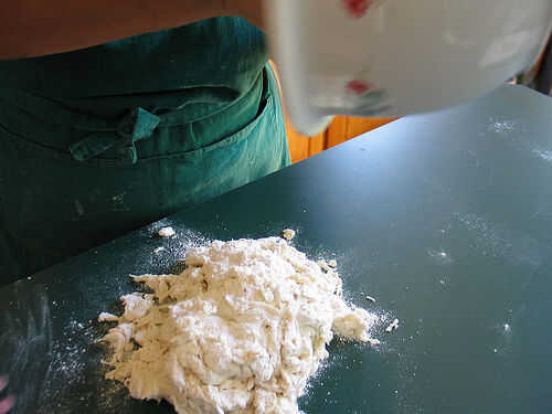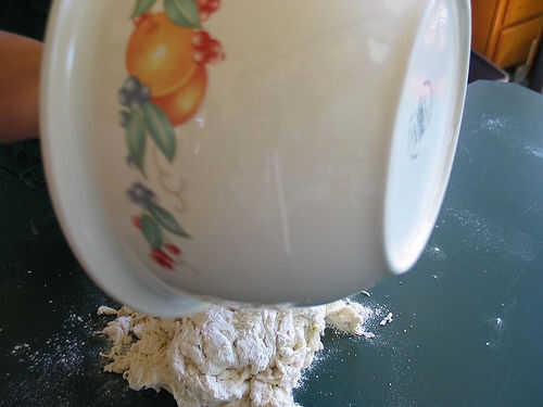 Ahora, esta parte es pegajoso y sucio, pero es importante recordar que la masa se reunirán en unos pocos minutos de trabajo. Usted quiere tratar de evitar la adición de harina en esta etapa porque hará que tu pan realmente dura y difícil de subir. Puedes enharinar un poco las manos y tal vez añadir una cucharada o menos de harina para la superficie de trabajo, pero lo que realmente quieres es trabajar los ingredientes que ya tienes una masa elástica suave.