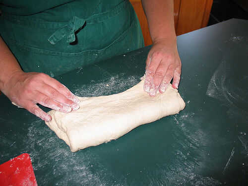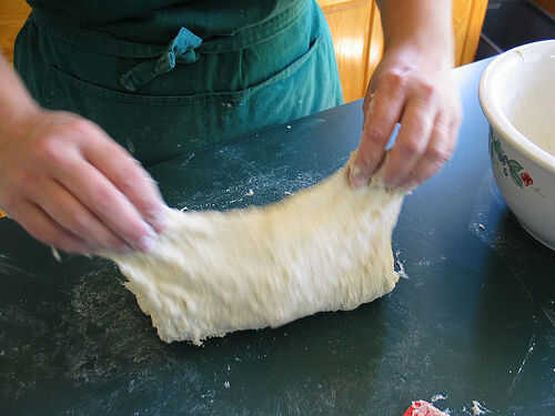 Seguir amasando y doblando hasta que la masa se convierte en elástico y elástico. Yo generalmente recoger fin y hace pivotar hacia fuera, luego doblarlo sobre sí mismo, luego doblar ese rectángulo por la mitad, longitudinalmente.