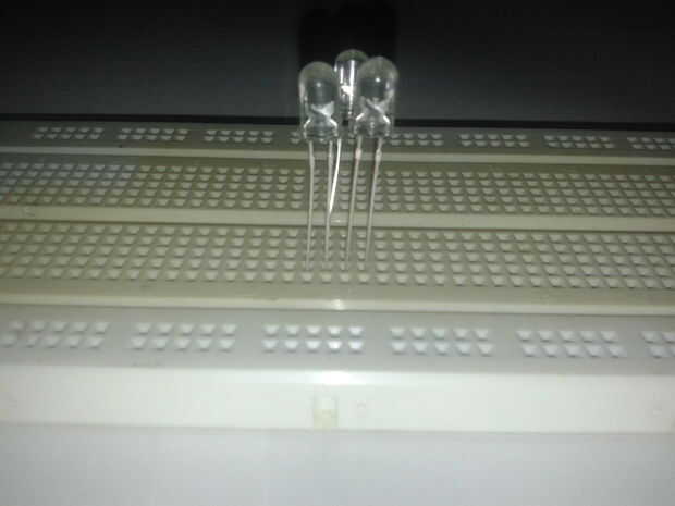 Ahora introducir el LED verde en el tablero del circuito y conectar el + ve final de verde llevó a la terminal - ve de Tri color LED