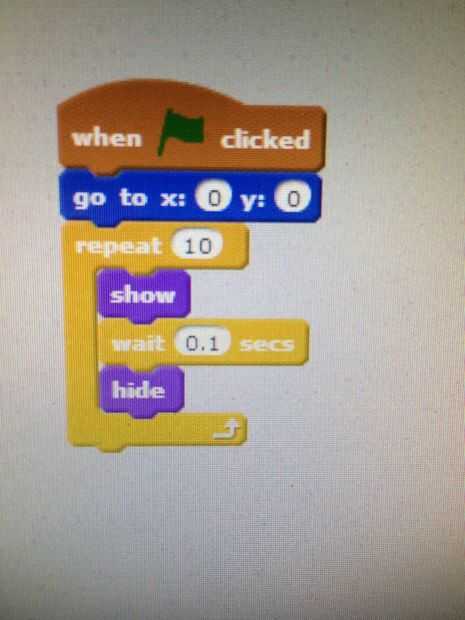 Ahora pinchas en el guión de la 3. A la derecha el siguiente código - cuando hace clic en bandera, ir a x: 0, y:0. La. Repetir 10. Dentro de este va poner Mostrar, luego esperar 0,1 seg y luego poner ocultar.