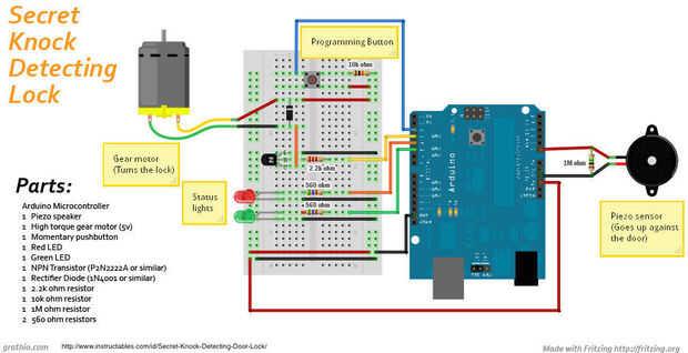Soldar un par de 12"(30cm) conduce al altavoz piezoeléctrico. Conexión entre el pin analógico 0 y el suelo. También Coloque el resistor de 1M ohm entre pin analógico 0 y el suelo. Prueba: Con el Arduino conectado al ordenador (mediante cable USB o Serial) y abrir la ventana de Serial Montor. (Es el botón más a la derecha en la parte superior del entorno de desarrollo Arduino.) Con el Arduino encendido usted debería ver el texto "Inicio del programa." Pulse el altavoz piezoeléctrico y usted debería ver el texto "noquear a partir" y "golpear" cada vez que toque. Parada para un segundo o dos y probablemente verás "Secreto golpe fracasado" o "Puerta abierta".