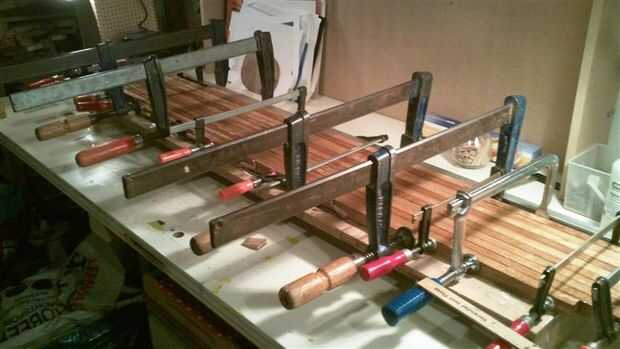 Después de mezclar su cepillo de epoxy lo suficientemente grueso, pero no mucho, a los lados de las tiras. Mantener un ojo en el tiempo debido a la vida de pote. Entonces cuando todas las tiras se pegan ponerlos juntos en el tablero de múltiplex y empotrar firmemente a lo largo de toda la longitud. Yo jodidos algunos tornillos en los lados la mordaza aún más y aún utilizan algunas cuñas entre ellas.