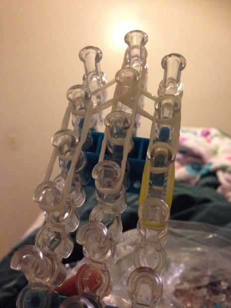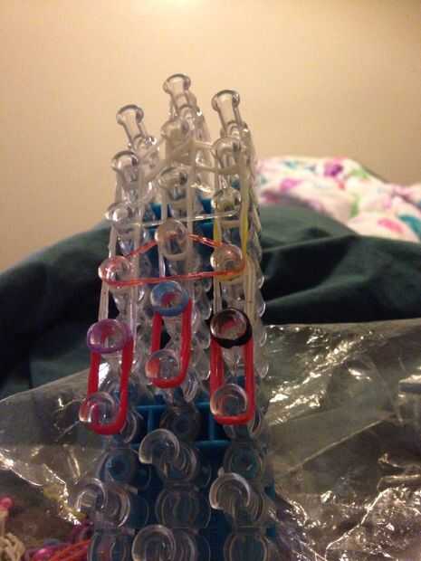 esto es un braclet muy fácil y divertido para hacer. Esperamos que disfrutes!Paso 1: materiales Se necesita: un telar, gancho, elásticos y un clip de C.Paso 2: Colocar los elásticos Primero escoger tres colores y a la clavija central. Sacó su color e