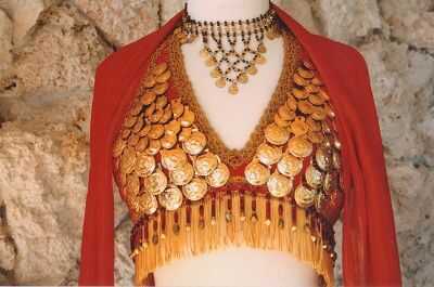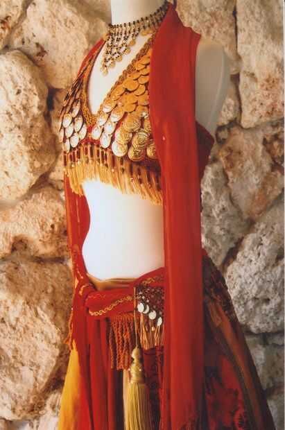este traje es muy fácil. La diversión parte busca la diversión adornos, borlas y flecos para adornar el traje con. Realmente hizo investigaciones en bailarinas períodos auténtico. Iba para una mirada más auténtica. La idea era hacer algo que no se ve en una tienda de disfraces. Bailarines que vendían allí dinero en sus trajes. Encontré un estiramiento de la correa en una tienda que tenía oro moneda - como medallones en él. Cortar los medallones de la correa y me cosió en una tapa del halter rojo que hice. Simplemente les cosió en filas como Tejas, luego agrega flecos y adornos de oro. Las faldas es ocho paneles de telas doradas y rojas que os adjunto recorte correspondiente, flecos, borlas y algunos medallones de oro en la cintura.