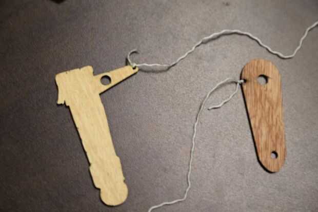 Corte cada cadena a 300 mm de longitud. Luego cada uno ate la cuerda alrededor del pequeño agujero de cada miembro.