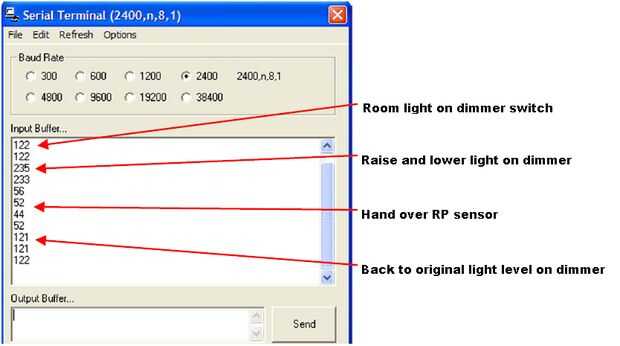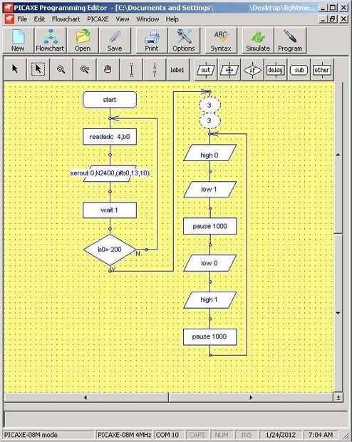 El "serout 0,N2400,(#b0,13,10)" entrada/salida no es necesaria para el ejecución del programa. He insertado para poder probar los niveles de luz en la sala del Editor de programación Serial Terminal y ajustar el programa en consecuencia. Al convertir el diagrama de flujo básico y programar el PICAXE presionando la tecla F8 para mostrar el Terminal Serial. En la foto puedes ver que he probado los niveles de luz en una habitación con un interruptor más dévil en la luz.